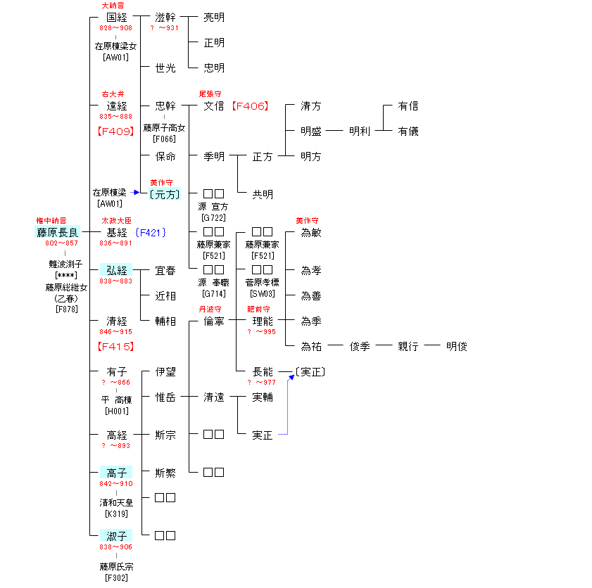 | F401:藤原冬嗣 | 藤原鎌足 ― 藤原房前 ― 藤原真楯 ― 藤原冬嗣 ― 藤原長良 | F405:藤原長良 |