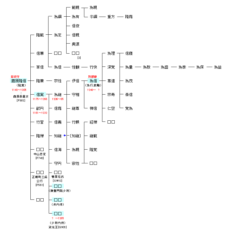 | F407:藤原為忠 | 藤原鎌足 ― 藤原房前 ― 藤原真楯 ― 藤原冬嗣 ― 藤原長良 ― 藤原文信 ― 藤原為忠 ― 藤原隆信 | F408:藤原隆信 | ● |