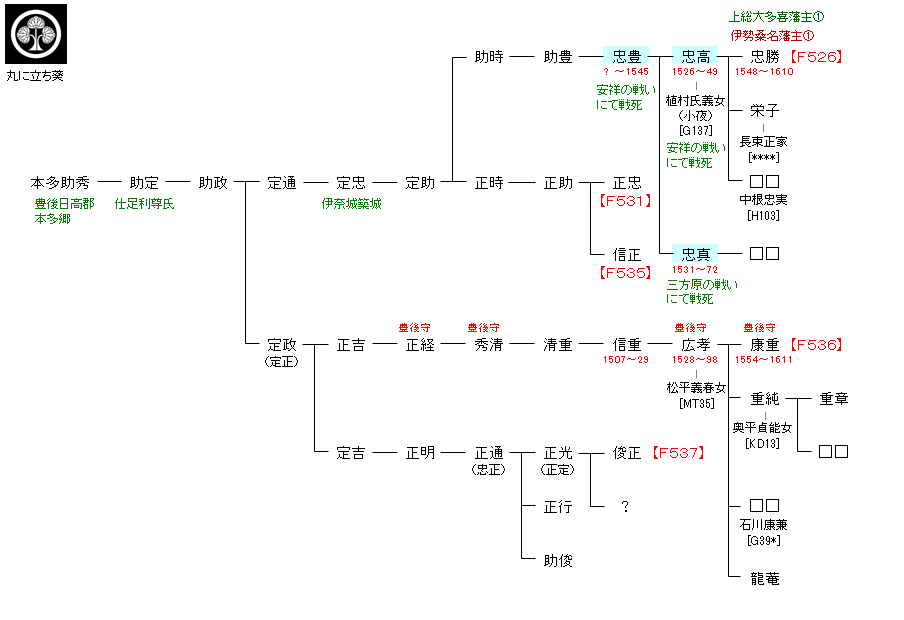 | F524:藤原兼通 | 藤原房前 ― 藤原冬嗣 ― 藤原良房 ― 藤原忠平 ― 藤原師輔 ― 藤原兼通 ― 本多助秀 | F525:本多助秀 |