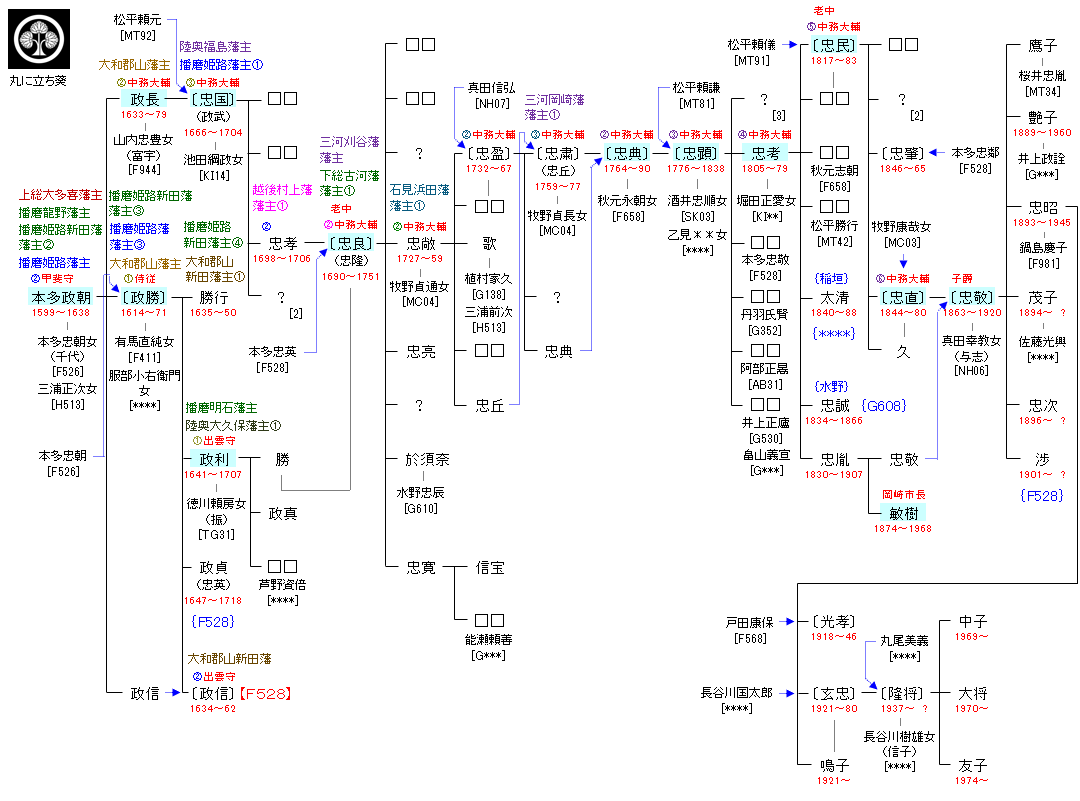 | F526:本多忠勝 | 藤原房前 ― 藤原冬嗣 ― 藤原良房 ― 藤原師輔 ― 藤原兼通 ― 本多助秀 ― 本多忠勝 ― 本多政朝 | F527:本多政朝 |