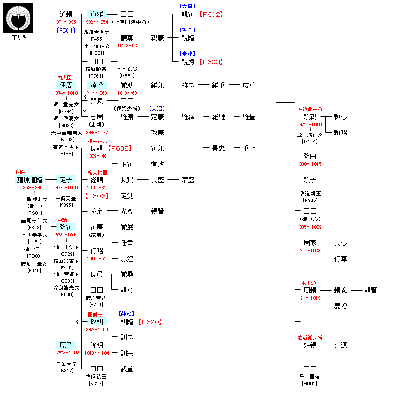 | F521:藤原師輔 | 藤原房前 ― 藤原冬嗣 ― 藤原良房 ― 藤原忠平 ― 藤原師輔 ― 藤原道隆 | F601:藤原道隆 |