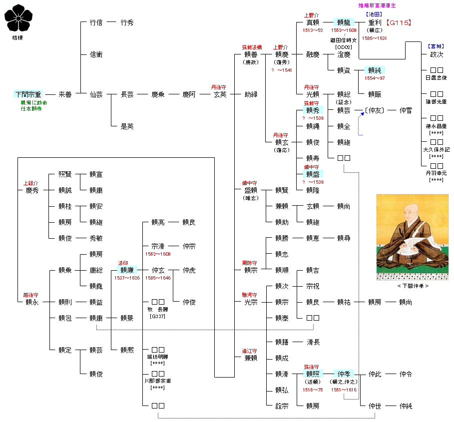 | G113:源 頼政 | 源 経基 ― 源 満仲 ― 源 頼光 ― 源 頼綱 ― 源 仲政 ― 源 頼政 ― 下間宗重 | G114:下間宗重 |