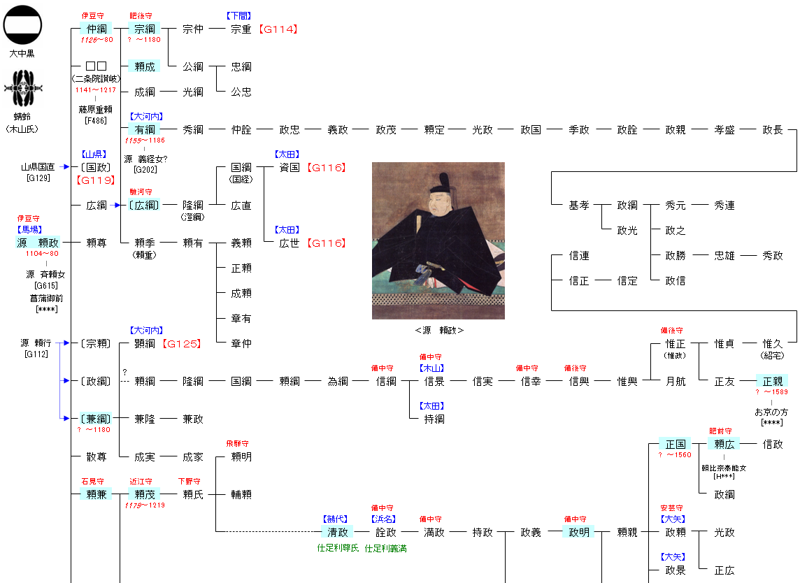 | G112:源 仲政 | 源 経基 ― 源 満仲 ― 源 頼光 ― 源 頼綱 ― 源 仲政 ― 源 頼政 | G113:源 頼政 |