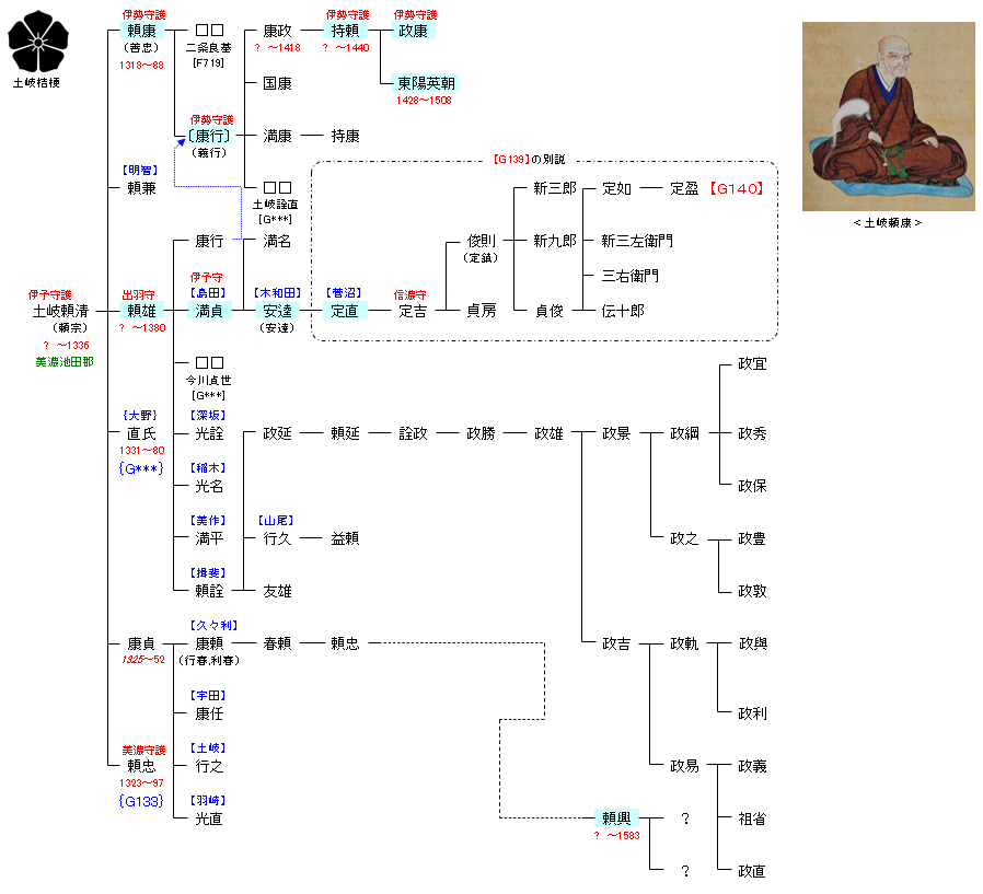 | G133:土岐頼貞 | 源 経基 ― 源 満仲 ― 源 頼光 ― 源 頼綱 ― 源 国房 ― 土岐光衡 ― 土岐頼貞 ― 土岐頼清 | G134:土岐頼清 |