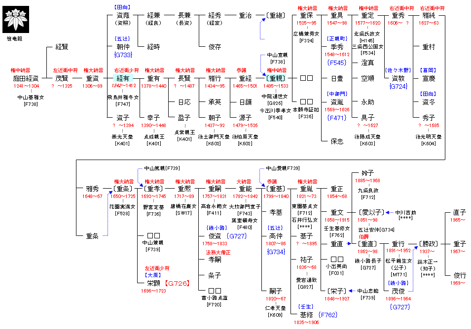 | G724:源 済政 | 宇多天皇 ― 源 雅信 ― 源 済政 ― 庭田経資 | G725:庭田経資 |