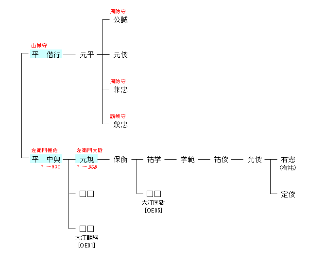 | K321:光孝天皇 | 光孝天皇 ― 是忠親王 ― 忠望王 ― 平 偕行/中興 | H903:平 偕行/中興 | ● |