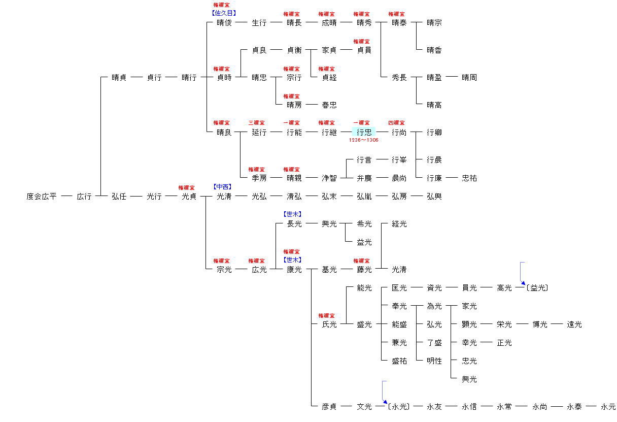 | 1251年(建長3年)から53年間、外宮の禰宜を務めた。しかし、1282年(弘安5年)に内宮の造営料木に口出しをしたため禰宜を免除され、京都に移り住んだ。京都で様々な教養を身に付け、時の関白であった公卿・鷹司兼平の命令により1285年(弘安8年)から1287年(弘安10年)にかけて神道五部書の所説を明らかにした著書『伊勢二所太神宮神名秘書』を著した。同書は亀山天皇に認められ、同年1287年に禰宜に復職した。 1293年(正応6年)に『伊勢二所太神宮神名秘書』の略本を著した。1298年(永仁6年)から1300年(正安2年)にかけて度会氏の家系を纏めた『古老口実伝』を著した。行忠による『大元神一秘書』の執筆の可能性も指摘される。 1304年(嘉元2年)に一禰宜になったが、翌年に亡くなった。行忠の後、同じく神道家の度会家行が禰宜となり、伊勢神道を確立した。 |
