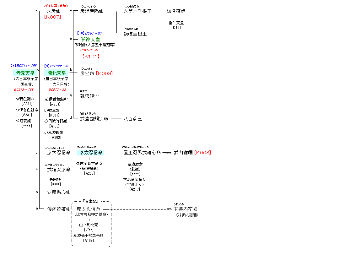 第9代天皇(在位:孝元天皇57年11月12日~開化天皇60年4月9日)。日本書紀』での名は稚日本根子彦大日日天皇。欠史八代の一人で、実在性については諸説ある。 16歳で皇太子となる。父帝が崩御した年の11月に即位。翌年、春日の率川宮に都を移す。以前の都とは大きく離れた大和盆地の北に位置している。即位6年、孝元天皇の妃(側室)だった伊香色謎命を皇后として御間城尊(後の崇神天皇)らを得た。また丹波竹野媛,和珥臣の祖の姥津命の妹の姥津媛を妃にしている。姥津媛との間には狭穂彦命,狭穂姫命,日葉酢媛命,神功皇后の祖となる彦坐王を得た。即位60年、崩御。 陵は春日率川坂上陵とされ、宮内庁により奈良県奈良市油阪町にある「念仏寺山古墳」に治定されている。墳丘長約100メートルの前方後円墳。 『日本書紀』『古事記』とも系譜の記載のみに限られ、欠史八代の1人に数えられる。「欠史八代」の天皇は、治世の長さが不自然であること、7世紀以後に一般的になるはずの父子間の直系相続であること、宮・陵の所在地が前期古墳の分布と一致しないこと等から、極めて創作性が強いとされる。一方で宮号に関する原典の存在、年数の嵩上げに天皇代数の尊重が見られること、磯城県主や十市県主との関わりが系譜に見られること等から、全てを虚構とすることには否定する見解もある。宝賀寿男は、古代日本では4倍年暦が使用されており、その場合、開化天皇の治世60年は実年で15年となり、他豪族との系譜関係から崇神天皇の兄弟または従兄弟とすれば、開化天皇が実在した可能性が高くなると主張した。