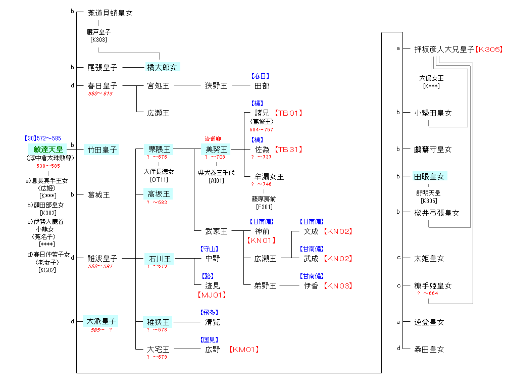 | K302:欽明天皇 | 継体天皇 ― 欽明天皇 ― 敏達天皇 | K304:敏達天皇 |