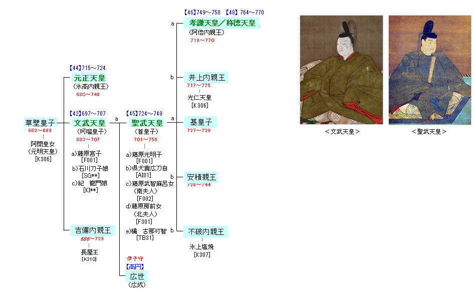 | K307:天武天皇 | 継体天皇 ― 欽明天皇 ― 敏達天皇 ― 押坂彦人大兄皇子 ― 天武天皇 ― 草壁皇子 | K308:草壁皇子 | ● |