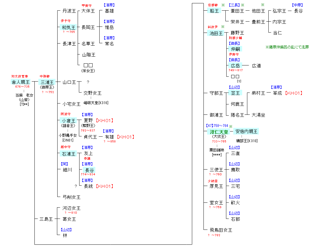 | K307:天武天皇 | 継体天皇 ― 欽明天皇 ― 敏達天皇 ― 押坂彦人大兄皇子 ― 天武天皇 ― 舎人親王 | K309:舎人親王 |