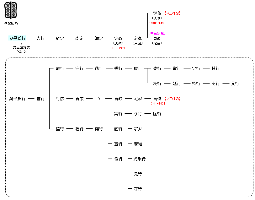 現存する史料からは、三河国作手郷に移住する貞俊以前の系譜についてははっきりしない。村上源氏の後裔と自称した赤松則景の末流(則景の子)とする説、武蔵七党児玉党後裔の氏行が則景の養子になったという説もある。いずれにせよ上野国甘楽郡奥平郷を領していたということは共通している。 ある史料では、赤松則景が東国へ下り源頼朝に従い、甘楽郡司畠山小幡右衛門尉政行の娘と結ばれ氏行が生まれたとする。氏行は政行の子の太郎行綱のもとで養われ、児玉本庄左衛門尉家定に婿入りし文治年間(1185~89年)小幡庄奥平邑(下奥平)に奥平城を構えて奥平姓を名乗り甘楽郡司を務めた。奥平氏は鎌倉期を通じて代々甘楽郡司を務め大いに繁栄したという。