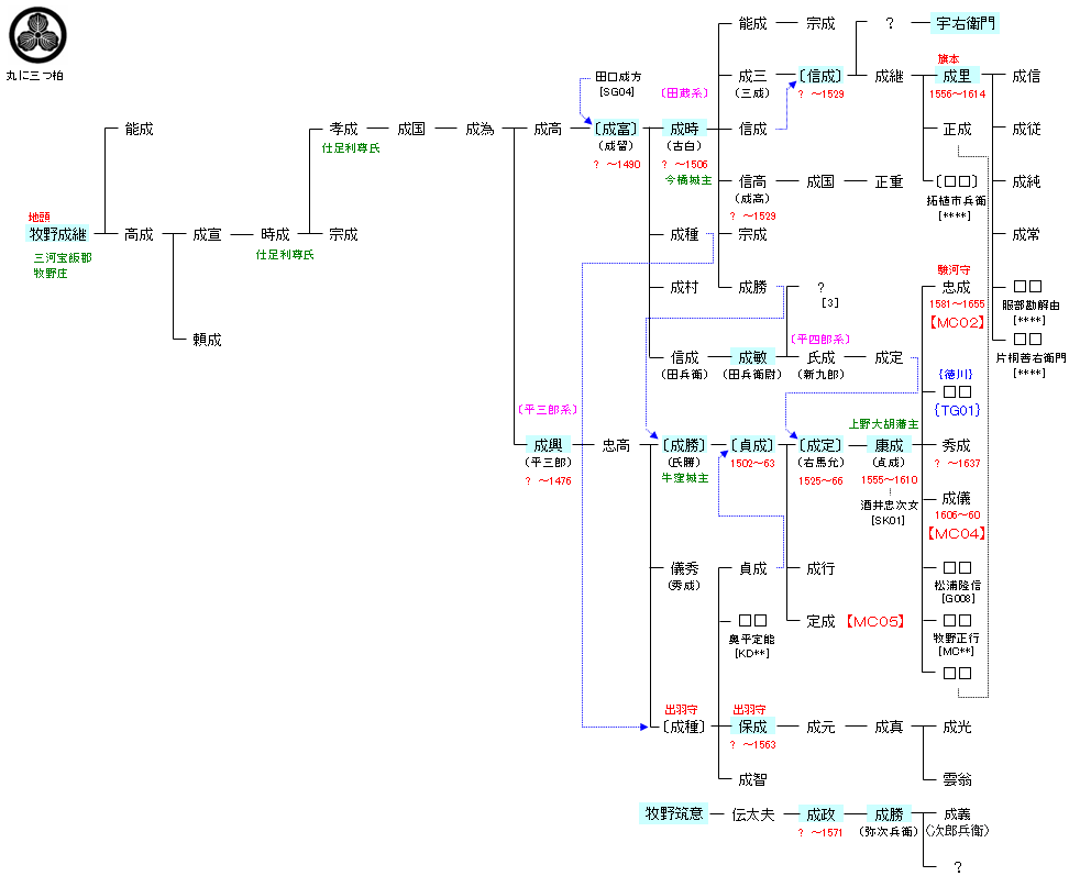 平三郎系は牧野時成のとき、元弘の乱(1332年)に足利尊氏に味方し、子の孝成が三州渥美郡内に恩賞の地数カ所を得た。その子・成国のときには三河守護一色範光に属し、その孫・成興は応仁の乱で一色義直に従い京合戦に参陣したとされる。牧野平三郎系はその後、応仁合戦に西軍一色義直麾下として参陣したため疲弊し、その勢力を著しく低下させたと思われ、一色義直の家臣・牧野成興(平三郎)は文明8年(1476年)死去し、その主君・義直が将軍足利義政に和睦を認められ三河守護職を放棄したために、その後衰えた。成興の子・忠高は継嗣がなく、一族牧野成種(出羽守),成勝を養子としたという。ここまでは、牧野家の系図・家譜等の家伝のみで伝承の類である。 |