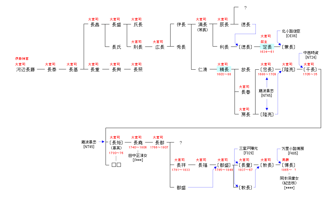 | NT24:大中臣忠時 | 中臣阿麻毘舎 ― 中臣御食子 ― 中臣名代 ― 大中臣真助 ― 大中臣忠時 ― 河辺長藤 | NT25:河辺長藤 | ● |