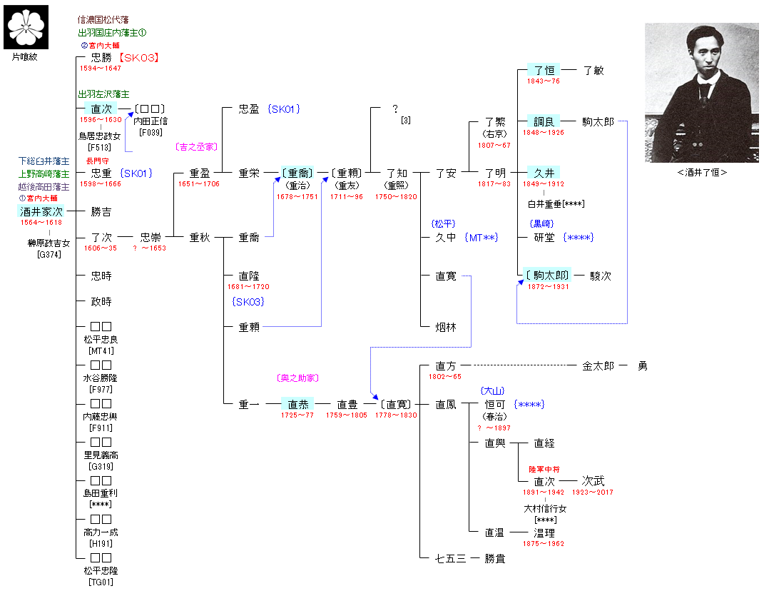 酒井直隆(叔父)は酒井忠勝6男の忠直の養子となり酒井奥之助家第2代を継いだが、子の嫡男・直通が早世し、次男の直豫が出羽松山藩2代藩主・酒井忠予の養子として迎えられたため、酒井奥之助家の家督は、直隆の実弟・重一の長男直恭が相続した。 |