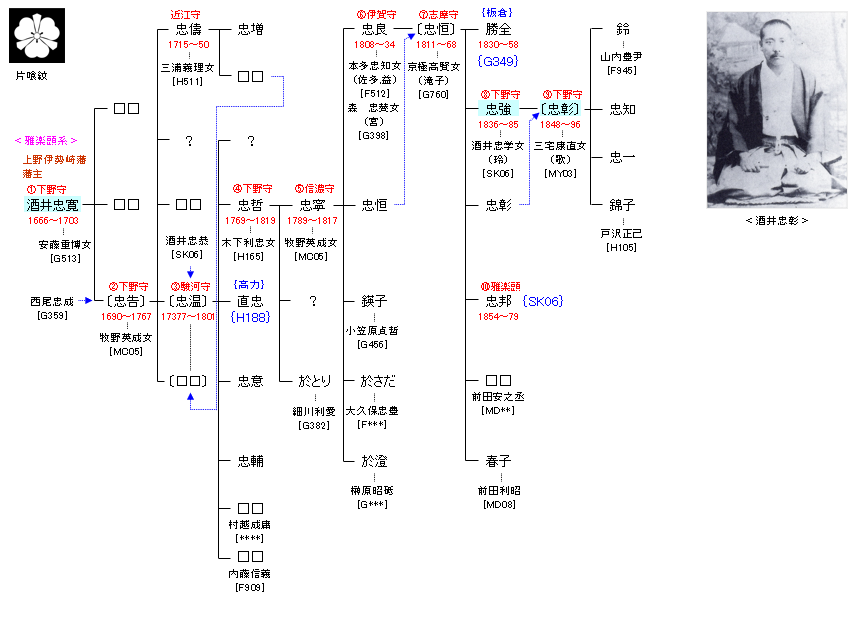 | SK05:酒井重忠 | 酒井忠明 ― 酒井重忠 ― 酒井忠寛 | SK07:酒井忠寛 | ● |