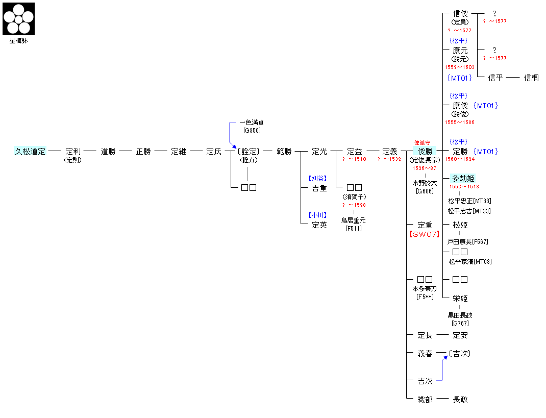 SW04:高辻是綱  土師身臣 ― 菅原古人 ― 菅原道真 ― 高辻是綱 ― 久松道定 SW06:久松道定