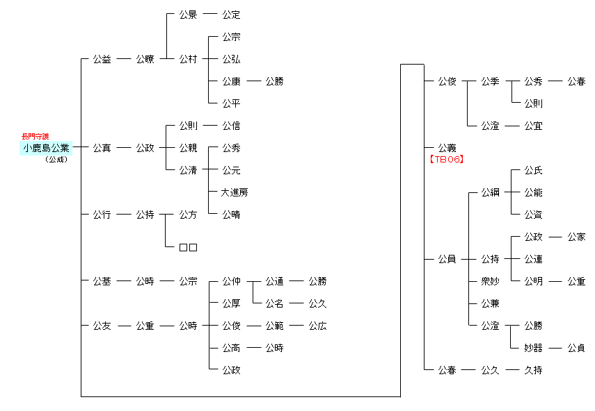 | TB04:橘 敏政 | 橘 諸兄 ― 橘 島田麻呂 ― 橘 広相 ― 橘 敏政 ― 小鹿島公業 | TB05:小鹿島公業 |