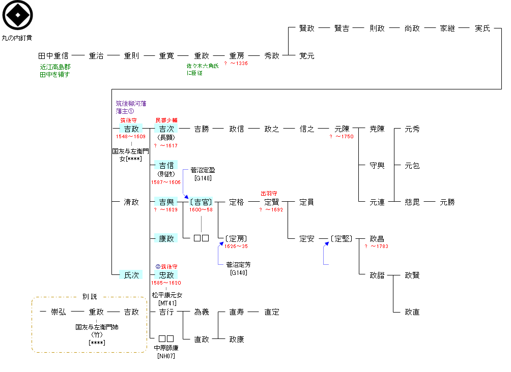 この系統は肥後細川藩士として続いていたが、吉政とは不和だったためか、柳川の田中本家断絶の折にも吉興に嗣子がない折にも養子を送ることはしていない。 |