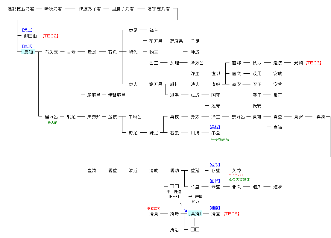 江戸時代に建部氏直系は「平重盛の孫・平高清の末裔」であることを主張したが、鎌倉時代、室町時代の公式文書にはすべて「平姓」ではなく「建部姓」で署名していること、平高清の没年と禰寝氏初代・清重の地頭職就任年が同年であることから見て疑わしい。 |