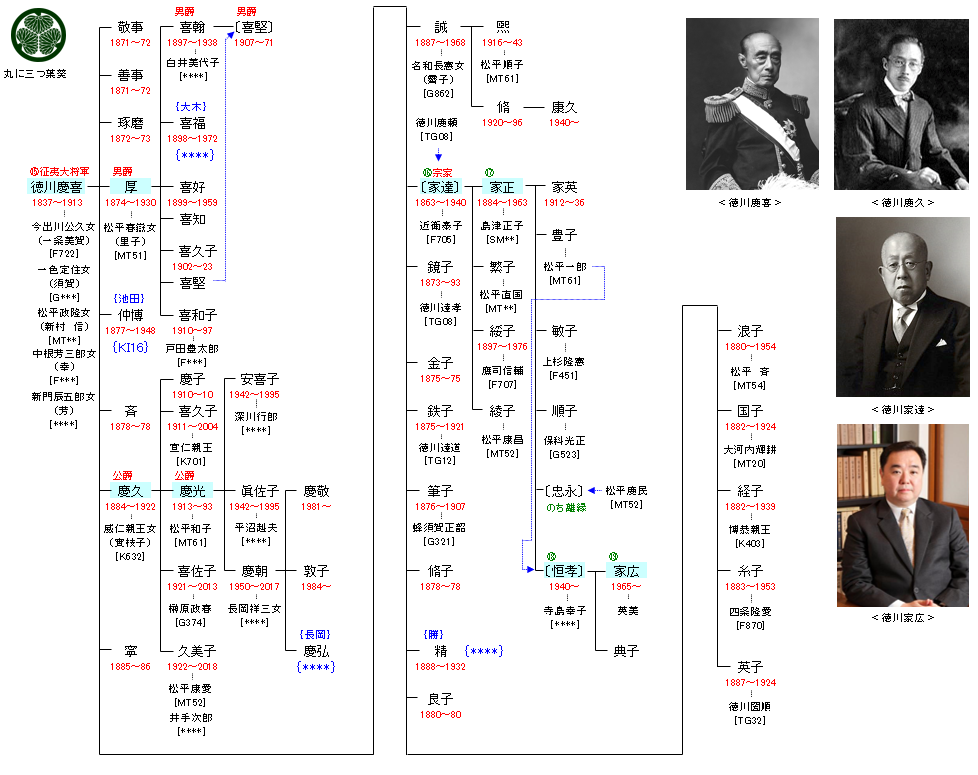 徳川宗家第16代当主。もとは御三卿の田安徳川家第7代当主で、静岡藩の初代藩主。幼名は亀之助。 |