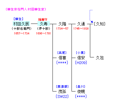 | YG03:柳生宗矩 | 土師身臣 ― 菅原古人 ― 菅原道真 ― 柳生永家 ― 柳生家厳 ― 柳生宗矩 ― (村田久辰) | YG04:村田久辰 | ● |