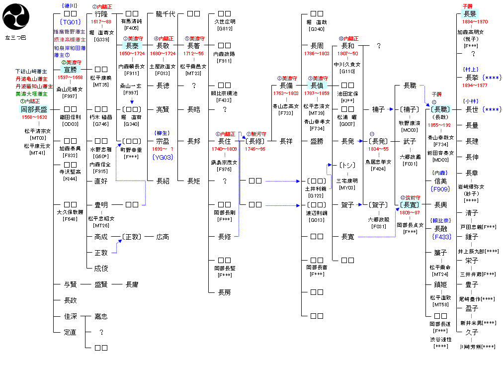 | F010:岡部泰綱 | 藤原武智麻呂 ― 藤原乙麻呂 ― 藤原為憲 ― 入江維清 ― 岡部泰綱 ― 岡部長盛 | F011:岡部長盛 | ● |
